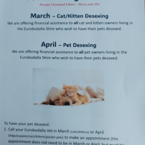 AWL Eurobodalla Desexing Promotion Calling all cat owners! If you live in Eurobodalla Shire, book your feline friend into the Eurobodalla vet of your... 01 Mar - 30 Apr 8:00 am - 4:00 pm