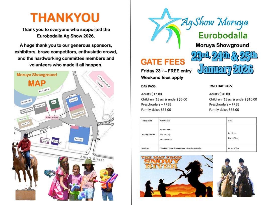 The 2026 AgShow Moruya Eurobodalla (this is our New Show name, and with a new logo) starts off with a new event this year. It is a free Film Night on Friday, the 23rd of January, after a day of horse events, with the film ‘The Man from Snowy River’. On Saturday and Sunday, the main show will feature the good things. Things like Jams, Photos, Art, Cookery, Junior Section, Craft, Needlework, Homebrewing, just to name a few. On Saturday, the Animal Hub will host an animal nursery, and on Sunday, it will host the Cattle Section and the Poultry Show in the Poultry Pavilion.