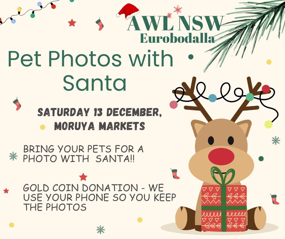 Come along to the Moruya Markets on 13 December from 10am and have your dog’s photo taken with Santa. Bring your phone for the photo, and instantly have a gorgeous picture of your furry friend with the Big Man.