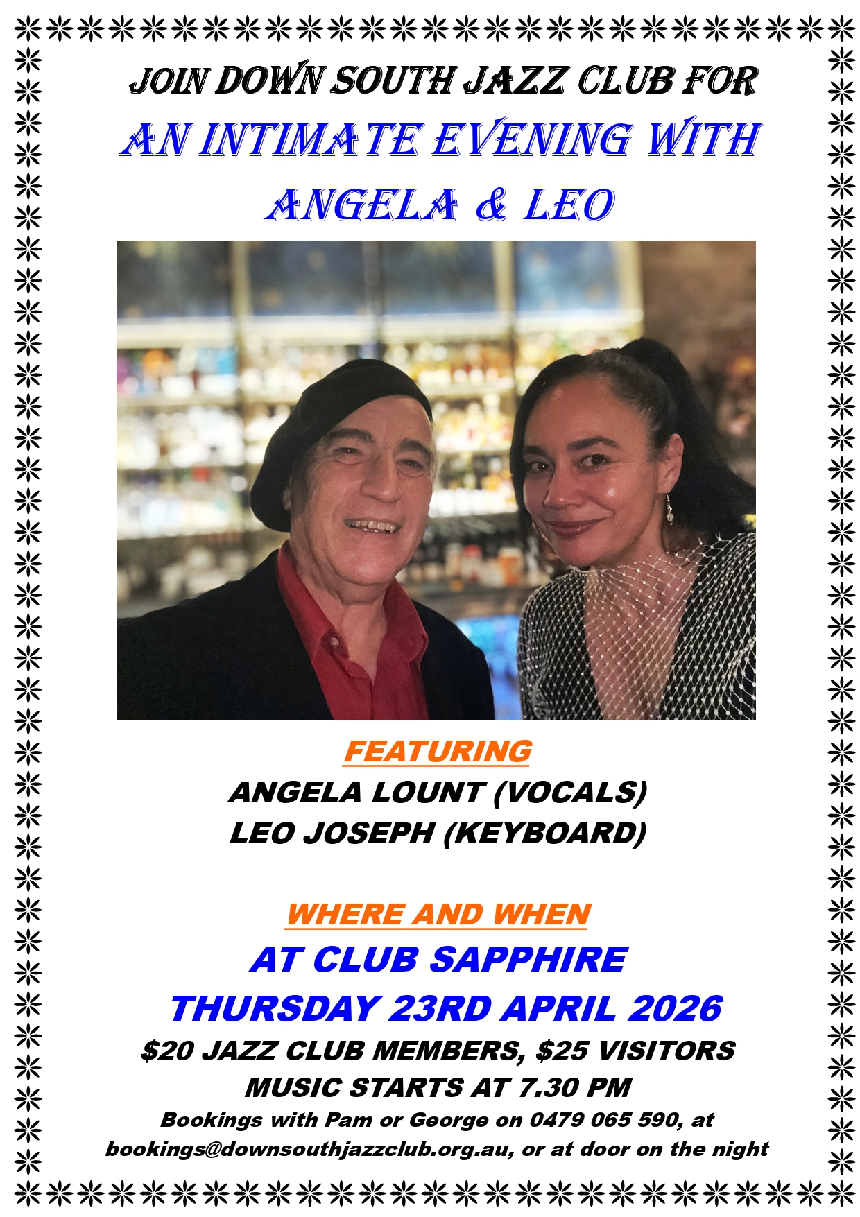 Down South Jazz Club- Angela and Leo Back to Community Events Advertisement Date Mar 23 2026 Expired! Time 7:00 pm - 10:00 pm Location Club Sapphire 119 Main St, Merimbula NSW 2548