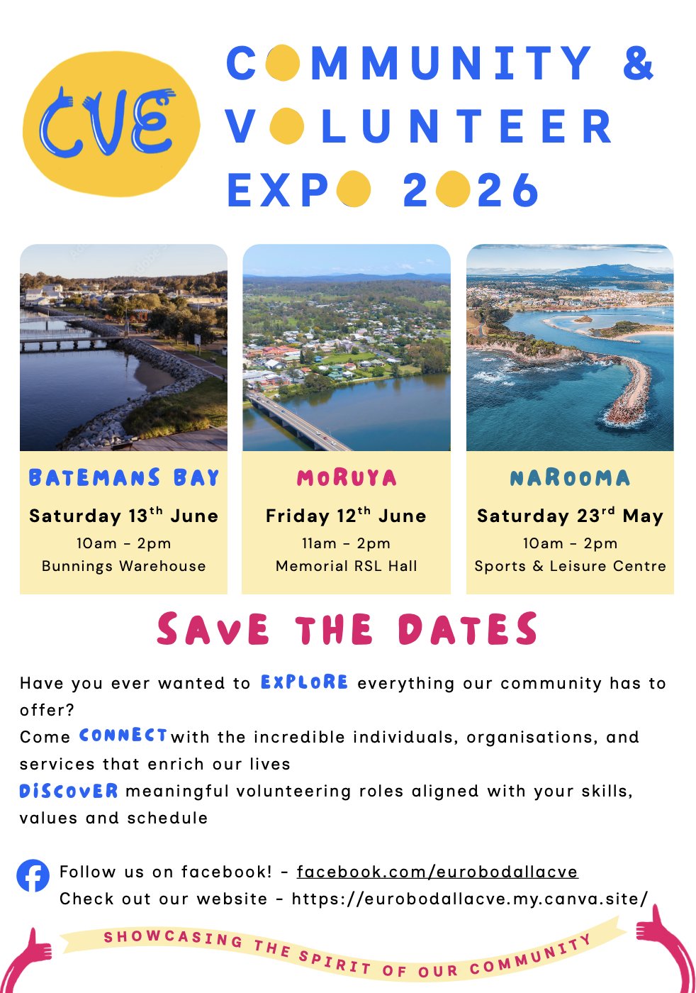 Eurobodall Community & Volunteers Expos will be held across 3 locations: Batemans Bay, Moruya and Narooma. They have been designed passionate volunteers from multiple community organisations, and supported by the Eurobodalla Community Support Network. The Expo’s purpose is twofold: to connect the public to the amazing local community organisations, services & volunteering opportunities, and to connect organisations to each other for a stronger, more resilient & collaborative network.