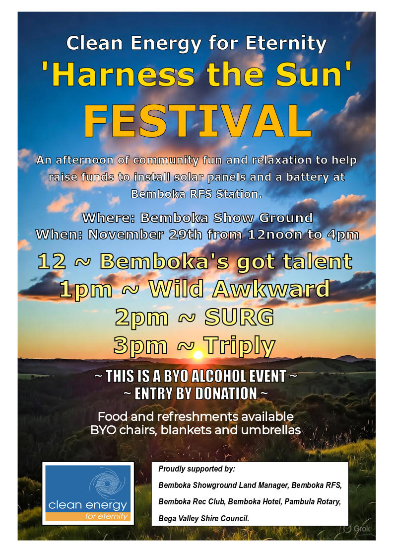 ‘Harness the Sun’ Bemboka RFS Fund Raiser is to bring awareness to the importance of having a reliable power source to enable reliable communications between fire crews and fire command in the event of a repeat of the 2020 fires, when communications were lost, and lives and property were put at risk due to mains power outages.