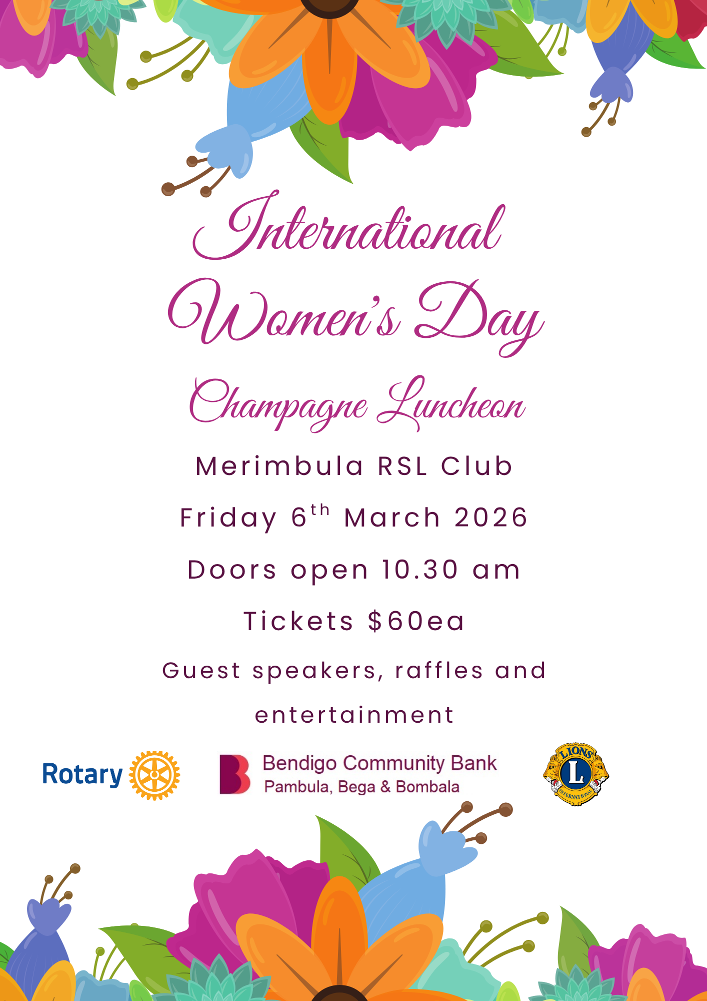 Introducing the 2026 International Women’s Day Champagne Luncheon! It will be held on Friday, 6 March at the Merimbula RSL Club. Doors will be open at 10.30 am and you will enjoy a delicious, 2-course lunch accompanied by a glass of champagne. You’ll have plenty of time to try your luck and purchase tickets for a wonderful array of raffle prizes, courtesy of our generous business community. The event will feature well-known guest speakers; Michelle Pettigrove of ‘Black Daisy’ and Hanna Marshall from the Merimbula Information Centre who will share their ideas and inspirations with us, along with an entertainment which our menfolk will enjoy as much as our ladies! Tickets are $60 and can be purchased from 2 February at the downstairs entrance of the Merimbula RSL Club.