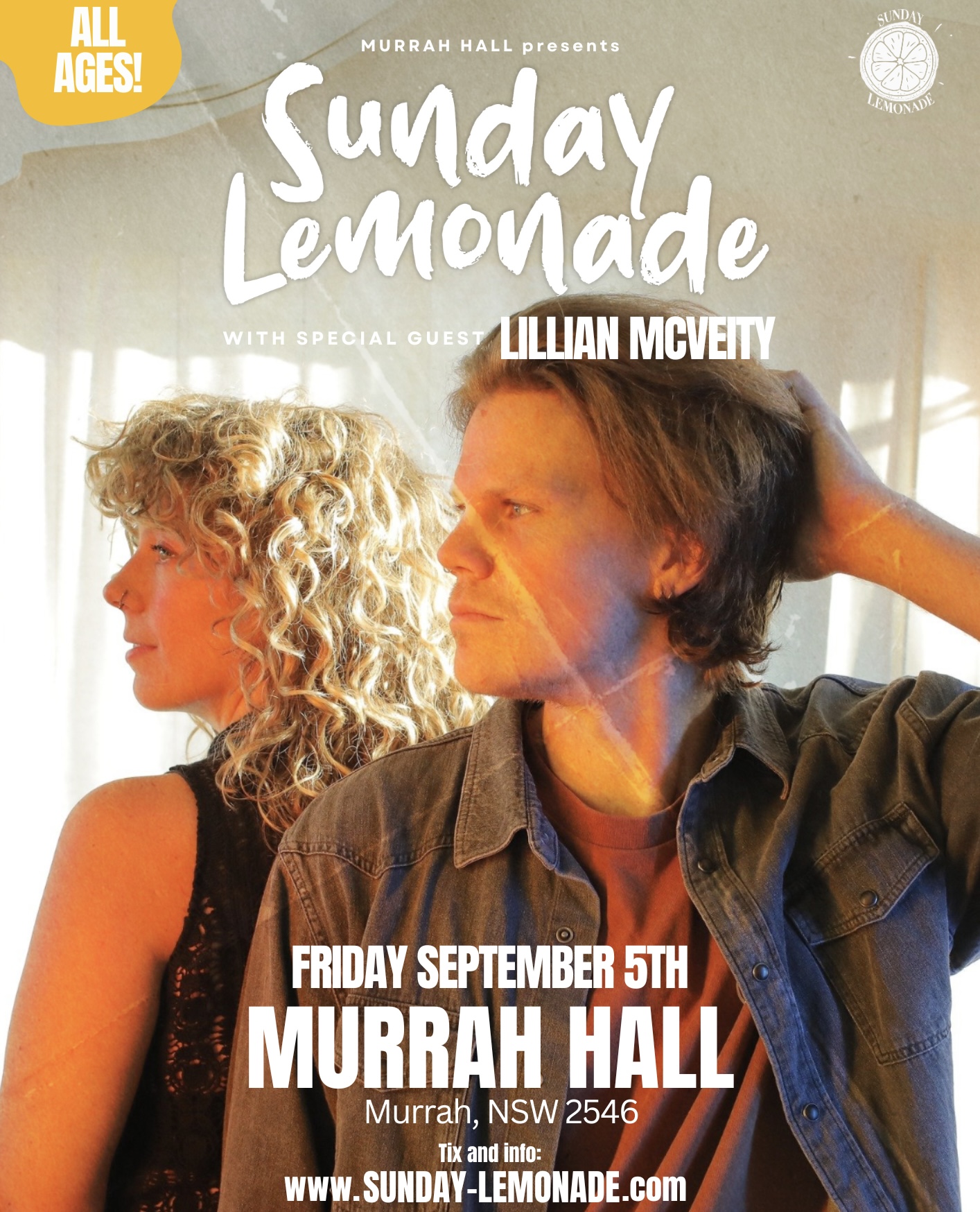 This September to November, join Tys & Loz as they celebrate their new single, “Lucy Goosey” all over Oz; from the winding roads of New South Wales to the rugged beauty of Western Australia and for their first time.. to beauty of Tasmania. From intimate gigs to festival stages, Sunday Lemonade will bring their infectious, feel-good sound and vibrant energy to towns big and small.