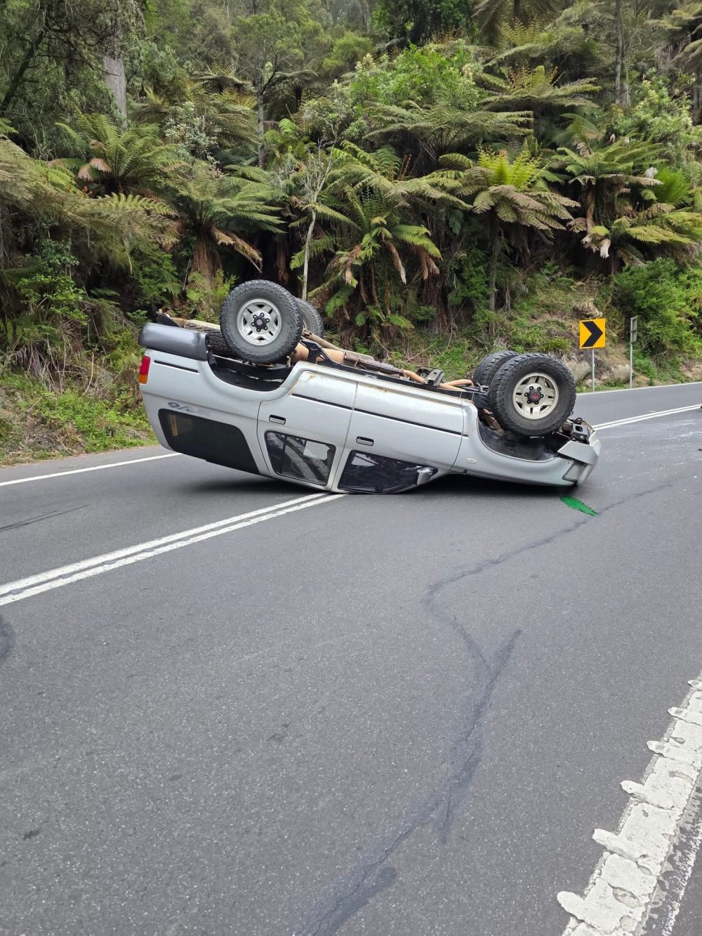 Emergency services were called out to reports of a single vehicle crash just after 5 o’clock and arrived to find a white SUV on its roof.